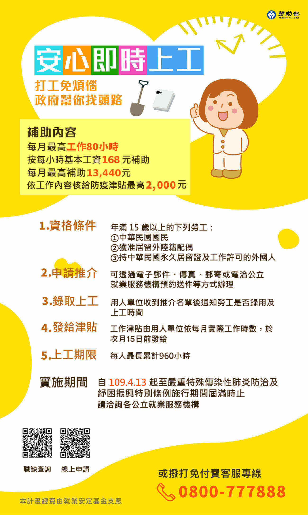 ◆工作津貼:每人每小時比照基本工資168元核給,每月最高可工作80小時;換言之,每人每月最高可領到1萬3440元。(80 x 168元)。上工期限則是每人最長以960小時為限。