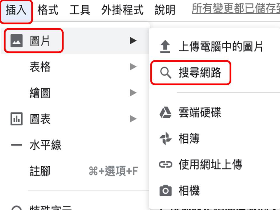 按下 header 的「插入」「圖片」「搜尋網路」就會出現下方圖示,在頁面上位於右側欄位。輸入你想找的圖片關鍵字,用拖曳功能放進文件,就會建立新的圖片。