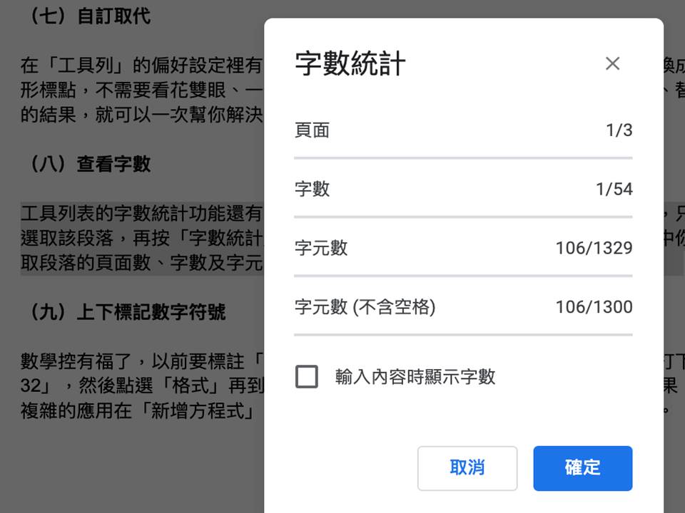 工具列表的字數統計功能還有一個用法,有些段落需要增補或刪去字數的時候,只要選取該段落,再按「字數統計」就能查看該段落的總字數,可以直接看到全文中你選取段落的頁面數、字數及字元數比例,以此根據做段落字元與字數控制。