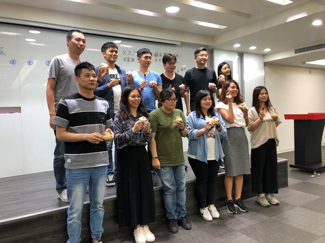 享用完食物後先開始慶生會的重點,為7-9月的壽星慶生啦!眼尖的人應該有發現我們的邱副總也是Q3壽星,手裡和大家一樣拿著小蛋糕是不是很可愛阿哈哈